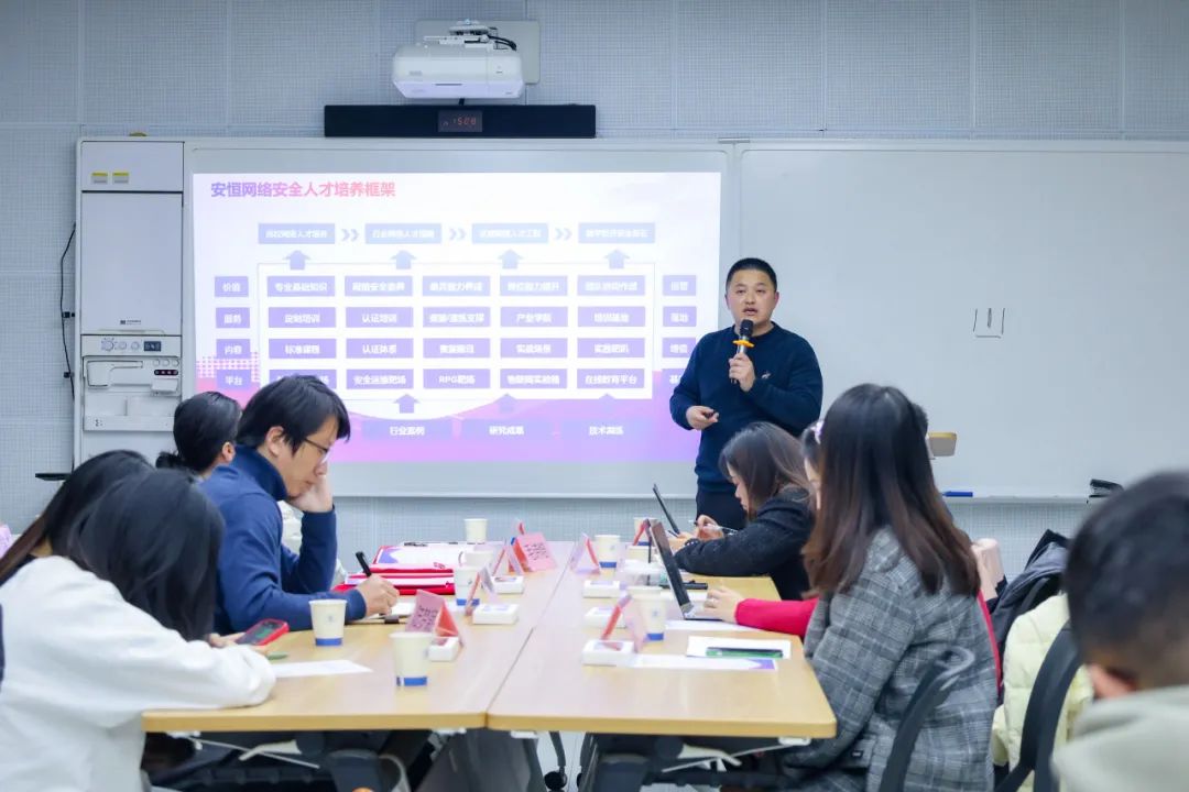 吳鳴旦介紹道,為響應(yīng)國(guó)家在網(wǎng)信人才培養(yǎng)方面的有關(guān)要求和高校求實(shí)創(chuàng)新需求,安恒信息以自身行業(yè)資源、產(chǎn)業(yè)背景和技術(shù)積累為基礎(chǔ),于2016年成立安恒數(shù)字人才創(chuàng)研院,并將人才戰(zhàn)略作為公司發(fā)展三大戰(zhàn)略之一。同時(shí),他還對(duì)網(wǎng)絡(luò)安全人才培養(yǎng)總體框架、體系作了介紹,并詳細(xì)說(shuō)明了重保網(wǎng)絡(luò)安全衛(wèi)士的培養(yǎng)方案、途徑、案例和成果等。