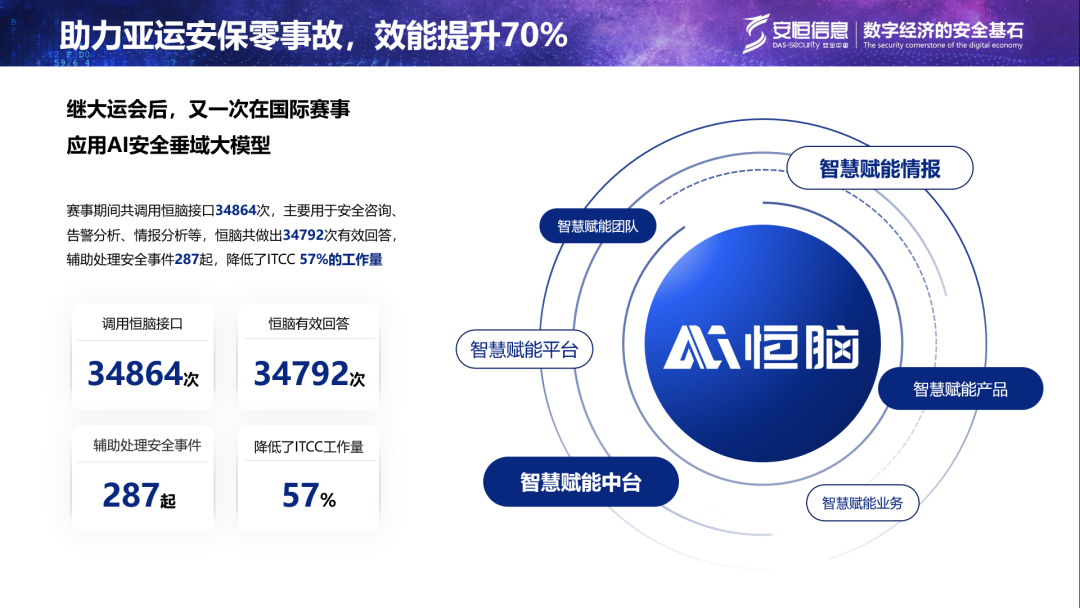 在本屆杭州亞運(yùn)會(huì)期間,該平臺(tái)與恒腦·安全垂域大模型深度結(jié)合,實(shí)現(xiàn)了AI對(duì)AI的管理與運(yùn)營,提升了安全運(yùn)營效能70%以上。這一成就為確保亞運(yùn)會(huì)的網(wǎng)絡(luò)安全保障工作圓滿完成、延續(xù)15年重保零事故的保障記錄貢獻(xiàn)了重要力量,代表著安全領(lǐng)域的新高度。