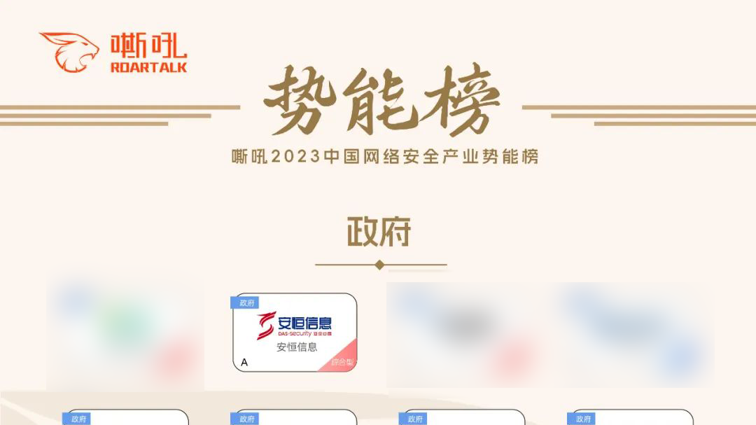 嘶吼安全產(chǎn)業(yè)研究院開展了《2023中國網(wǎng)絡(luò)安全產(chǎn)業(yè)勢能榜》的評選,旨在深入研判和展望中國網(wǎng)絡(luò)安全產(chǎn)業(yè)的發(fā)展趨勢,賦能網(wǎng)安領(lǐng)域頭部廠商擔(dān)負(fù)起自主創(chuàng)新、乘勢而上的產(chǎn)業(yè)責(zé)任。安恒信息成功入選“政府”與“制造”兩大榜單。這一榮譽是對安恒信息在這兩大行業(yè)中數(shù)字安全領(lǐng)域的領(lǐng)先地位和卓越能力的肯定。作為行業(yè)的領(lǐng)軍企業(yè)之一,安恒信息一直致力于為用戶提供一站式綜合服務(wù)和解決方案,并針對不斷變化的數(shù)字安全威脅和用戶需求持續(xù)進行技術(shù)研發(fā)和創(chuàng)新。