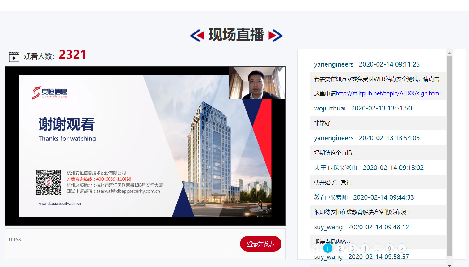 疫情當(dāng)前,安全在線。為了保障在線教育系統(tǒng)安全,今日,安恒信息正式發(fā)布在線教育系統(tǒng)安全整體解決方案。與以往不同的是,這次發(fā)布會全部流程都是在線上進(jìn)行,精彩的“直播+互動+答疑”形式也吸引了超過2000名觀眾參與。
