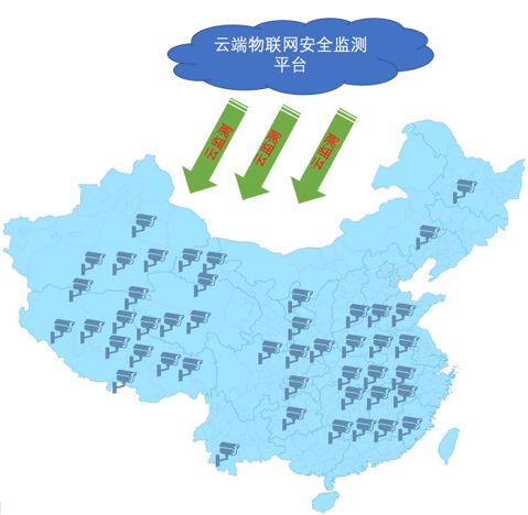 針對本地區(qū)資產(chǎn)情況與風(fēng)險情況,鑒于當(dāng)前疫情時期,可以優(yōu)先采用安恒信息云端物聯(lián)網(wǎng)安全監(jiān)測平臺進行安全檢查,徹底理清轄區(qū)視頻監(jiān)控資產(chǎn)情況,并提供安全分析報告。其工作模式如圖: