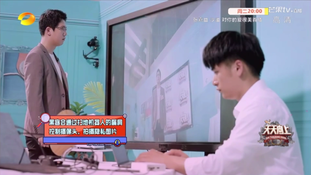 家用攝像頭同樣也是現(xiàn)下家庭里常用的智能家居設(shè)備,幫助人們外出后也能關(guān)注到家里的情況,方便對家中老人、小孩及寵物的看護(hù),也可以是人們生活中的看家好幫手。然而,它同樣存在著安全隱患,可能被入侵?jǐn)z像頭的黑客所控制,盜取使用者的隱密信息。節(jié)目現(xiàn)場同樣模擬了相似場景:鐘文潔和徐井源扮演“黑客”,利用漏洞控制攝像頭并截獲了相關(guān)視頻信息。