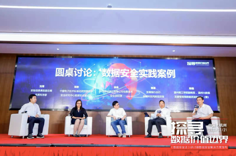 ▲ 從左到右依次為:安恒信息高級副總裁、首席科學家劉博;中國電子技術(shù)標準化研究院網(wǎng)絡(luò)安全研究中心數(shù)據(jù)安全部主任胡影;浙江移動信息技術(shù)部安全室經(jīng)理徐良;浙商銀行總行金融科技風險監(jiān)控官駱鑒;溫州理工學院副教授、溫州大數(shù)據(jù)發(fā)展管理局數(shù)據(jù)資源處處長(兼)
