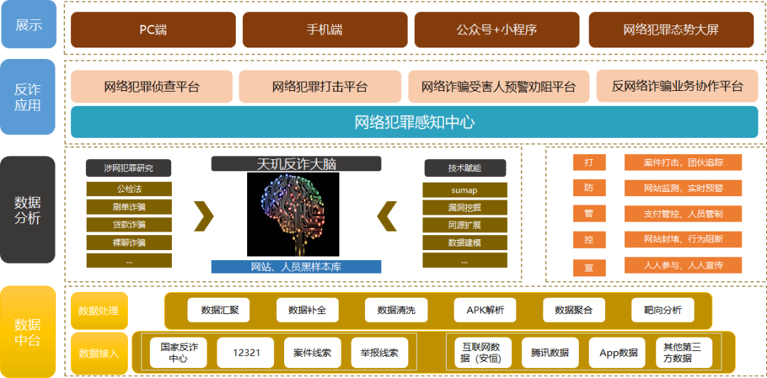 方案以網(wǎng)站封堵和潛在受害者精準(zhǔn)識(shí)別預(yù)警為核心,構(gòu)建全民參與、警企合作、部門協(xié)調(diào)的打防管控宣一體化的反詐平臺(tái),最終實(shí)現(xiàn)對(duì)轄區(qū)網(wǎng)絡(luò)詐騙的打、防、管、控、宣。