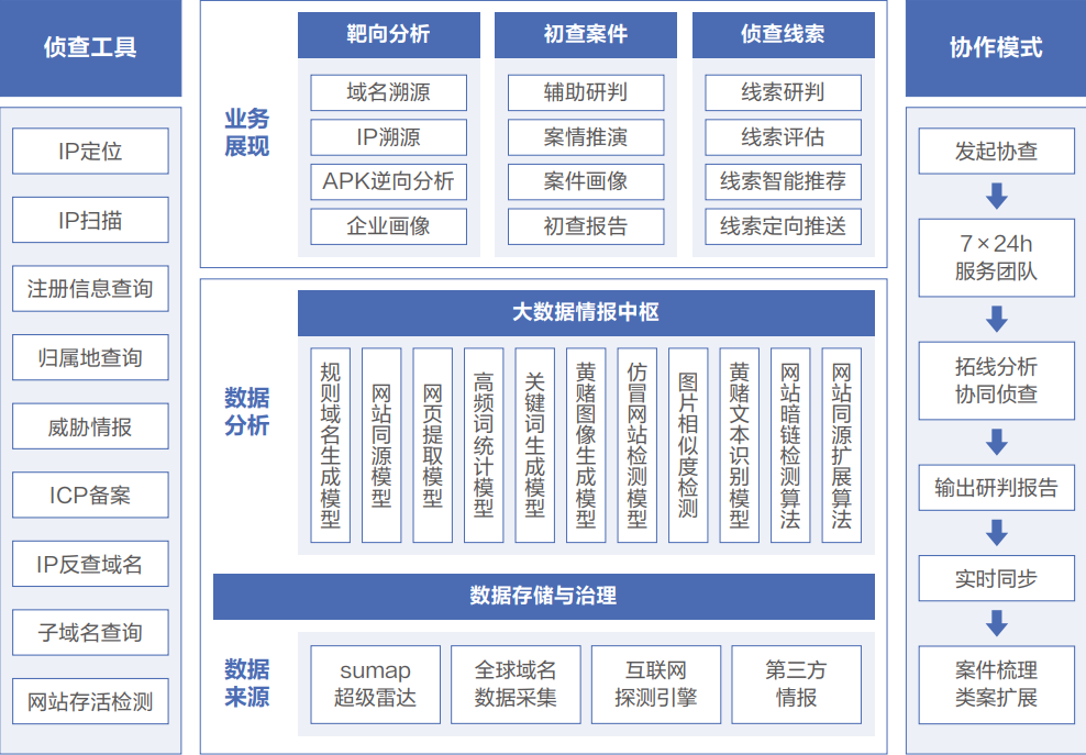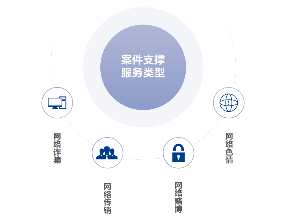 涉網(wǎng)犯罪偵查打擊支撐平臺(tái),采用云端SaaS化服務(wù)模式,將互聯(lián)網(wǎng)情報(bào)和安服力量整合為一體,向公安機(jī)關(guān)提供工具支撐、案件線索等,實(shí)現(xiàn)對(duì)涉網(wǎng)犯罪整體案件的“專業(yè)評(píng)估、高效分析、簡(jiǎn)單協(xié)作”。