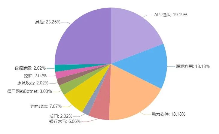 按照攻擊類型,其中APT攻擊比例最高為19.19%,勒索軟件收錄占比第二,為18.18%。
