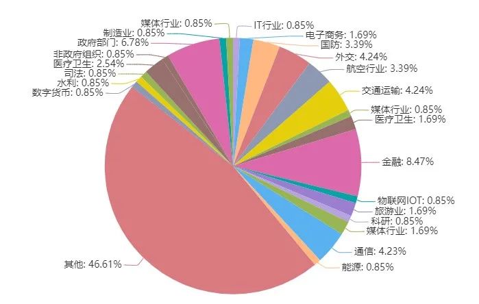 11月多數(shù)行業(yè)均遭到不同程度的惡意威脅,按照攻擊行業(yè),分布如下,其中政府部門、金融、外交、通信、交通運輸收錄內(nèi)容占比較高。