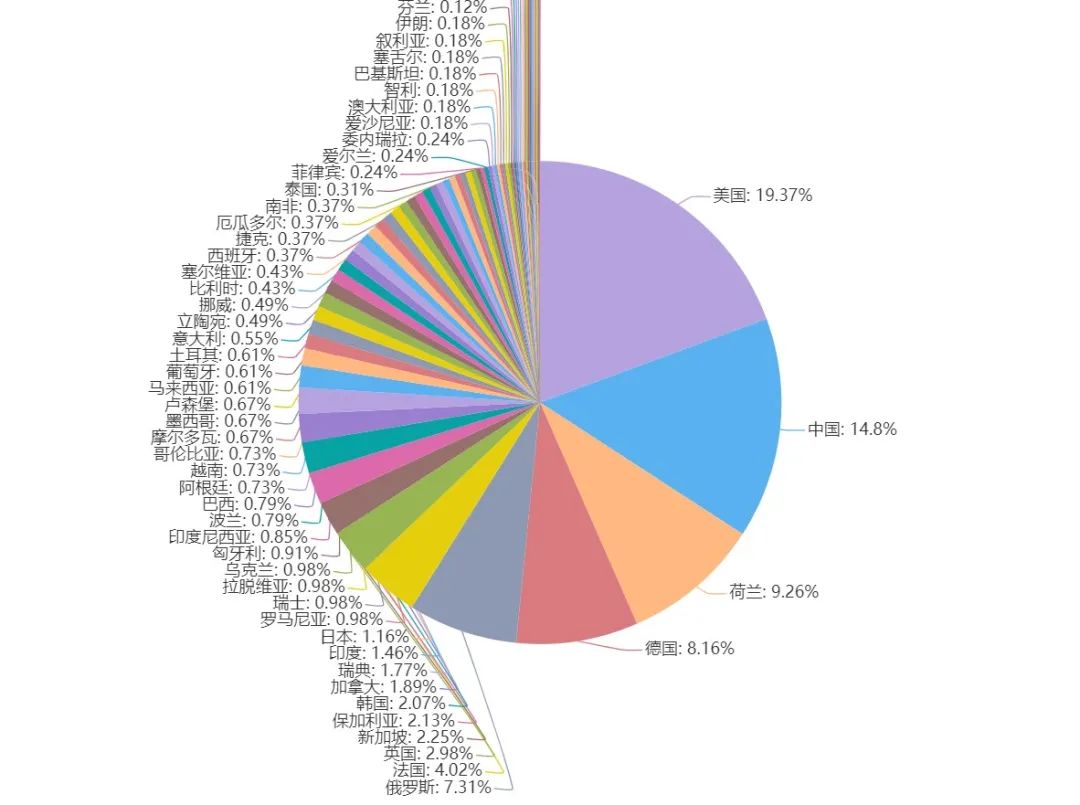 安恒威脅情報中心針對11月惡意IP情報進(jìn)行分析,整理出11月惡意IP資產(chǎn)分布地圖,其中在全球分布地圖中,惡意IP最多的前10個國家分別為美國、中國、荷蘭、德國、俄羅斯、法國、英國、新加坡、保加利亞、韓國。其中美國的惡意IP情報最高,占所有資產(chǎn)19.37%。