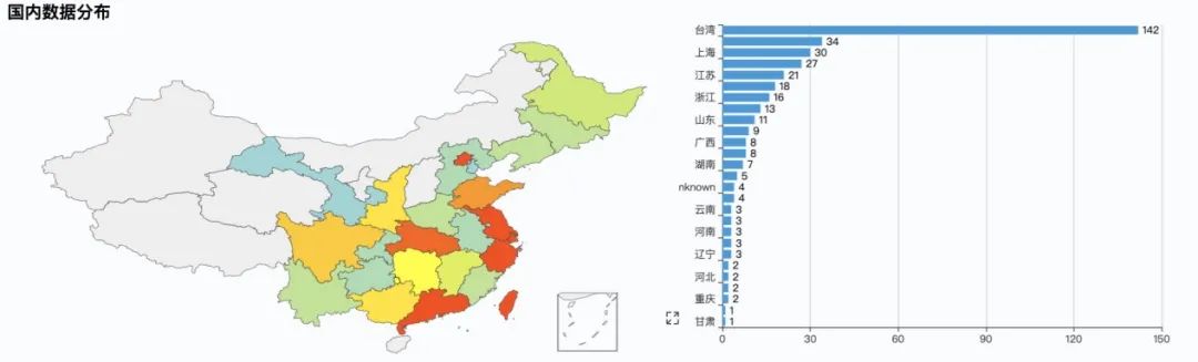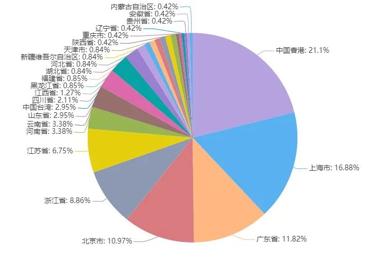 以中國的省市分布來看,IP惡意情報分布排名前5的分別為中國香港、上海、廣東、北京、浙江,其中中國香港的惡意IP占比最高,為21.1%。