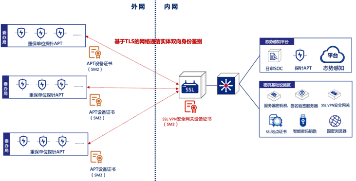 為此,安恒信息進(jìn)一步將APT探針設(shè)備、SSL VPN安全網(wǎng)關(guān)進(jìn)行優(yōu)化升級(jí),通過適配TLCP協(xié)議(GB/T 38636-2020 《信息安全技術(shù) 傳輸層密碼協(xié)議》),并部署國密設(shè)備數(shù)字證書,實(shí)現(xiàn)通信實(shí)體間的雙向身份鑒別,進(jìn)一步保護(hù)重要數(shù)據(jù)傳輸?shù)臋C(jī)密性、完整性,滿足密評(píng)合規(guī)要求。