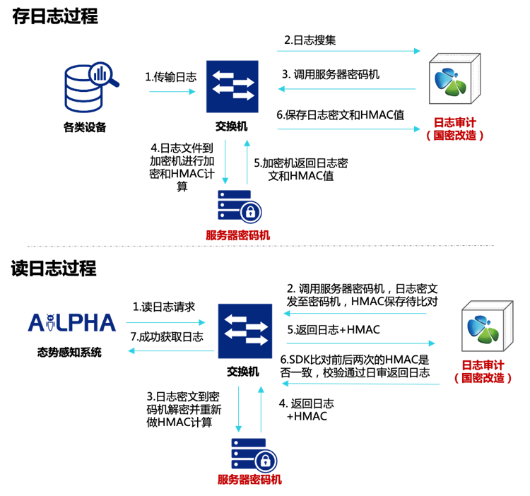 為此,安恒信息將日志數(shù)據(jù)匯聚流轉(zhuǎn)的“咽喉要地”日志審計(jì)系統(tǒng)進(jìn)行優(yōu)化升級(jí),使其可直接對(duì)服務(wù)器密碼機(jī)進(jìn)行接口調(diào)用,用戶通過簡單配置即可通過SM4加密、HMAC-SM3等方式實(shí)現(xiàn)日志數(shù)據(jù)的機(jī)密性和完整性保護(hù)。