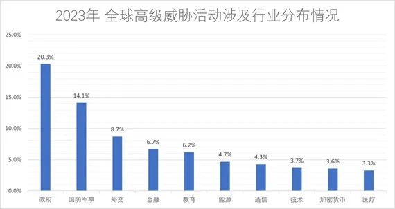 《報告》指出,全球的復雜局勢,使得2023 年高級威脅活動主要專注于攻擊政府、國防軍事、外交、通信和能源等關鍵行業(yè)。政府機構是攻擊的首要目標,因為涉及到國家治理、決策制定和國家安全的核心職能。針對國防軍事領域的攻擊旨在竊取軍事機密、戰(zhàn)略計劃和軍事技術,對國家的軍事優(yōu)勢構成直接威脅。