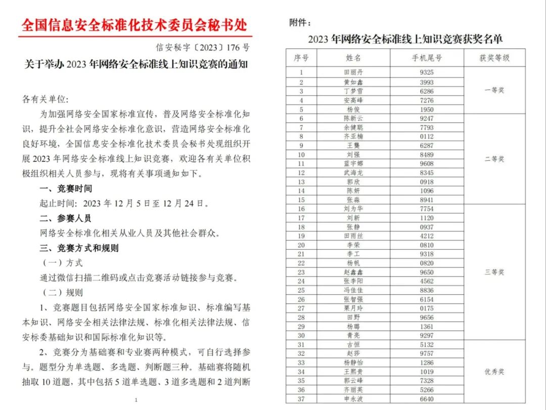 1月10日,在全國(guó)信息安全標(biāo)準(zhǔn)化技術(shù)委員會(huì)組織開展的2023年網(wǎng)絡(luò)安全標(biāo)準(zhǔn)知識(shí)競(jìng)賽中,安恒信息田麗丹作為企業(yè)代表參賽并獲得一等獎(jiǎng)。