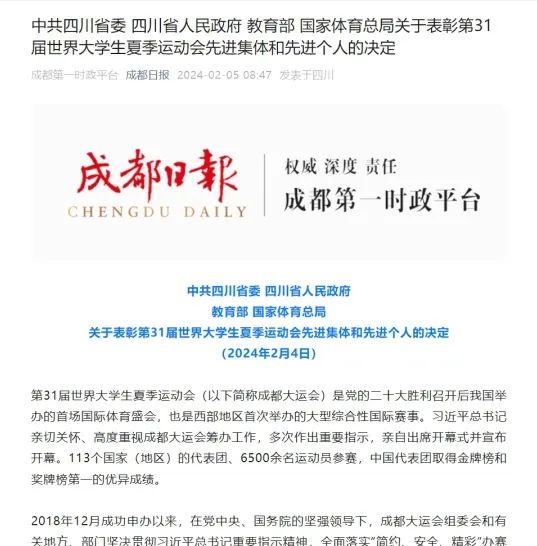 2024年2月4日,為表彰先進(jìn)、樹立典型,激勵(lì)廣大干部群眾建功新時(shí)代、奮進(jìn)新征程,中共四川省委、四川省人民政府、教育部、國家體育總局決定,授予成都大運(yùn)會(huì)龍泉驛賽區(qū)委員會(huì)等集體“第31屆世界大學(xué)生夏季運(yùn)動(dòng)會(huì)先進(jìn)集體”稱號(hào),安恒信息獲此稱號(hào)。