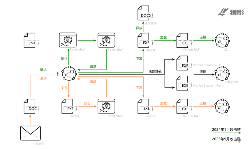 釣魚郵件附件DOC文件,帶有惡意宏代碼,運行后請求遠程服務器,下載用于執(zhí)行Powershell的EXE文件,Powershell指令執(zhí)行后,進一步下載Loader,最終在內存解密加載Venom RAT。