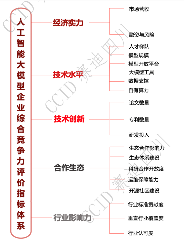 《2023中國人工智能大模型企業(yè)綜合競(jìng)爭力50強(qiáng)研究報(bào)告》對(duì)企業(yè)在人工智能大模型領(lǐng)域的競(jìng)爭力進(jìn)行多維度評(píng)價(jià),綜合考慮企業(yè)經(jīng)濟(jì)實(shí)力、技術(shù)水平、技術(shù)創(chuàng)新、合作生態(tài)、行業(yè)影響力5個(gè)一級(jí)指標(biāo),市場(chǎng)營收、融資與風(fēng)險(xiǎn)、模型開放平臺(tái)等19個(gè)二級(jí)指標(biāo),最終形成企業(yè)在人工智能大模型領(lǐng)域的競(jìng)爭力綜合評(píng)價(jià)指標(biāo)體系,如下圖所示。