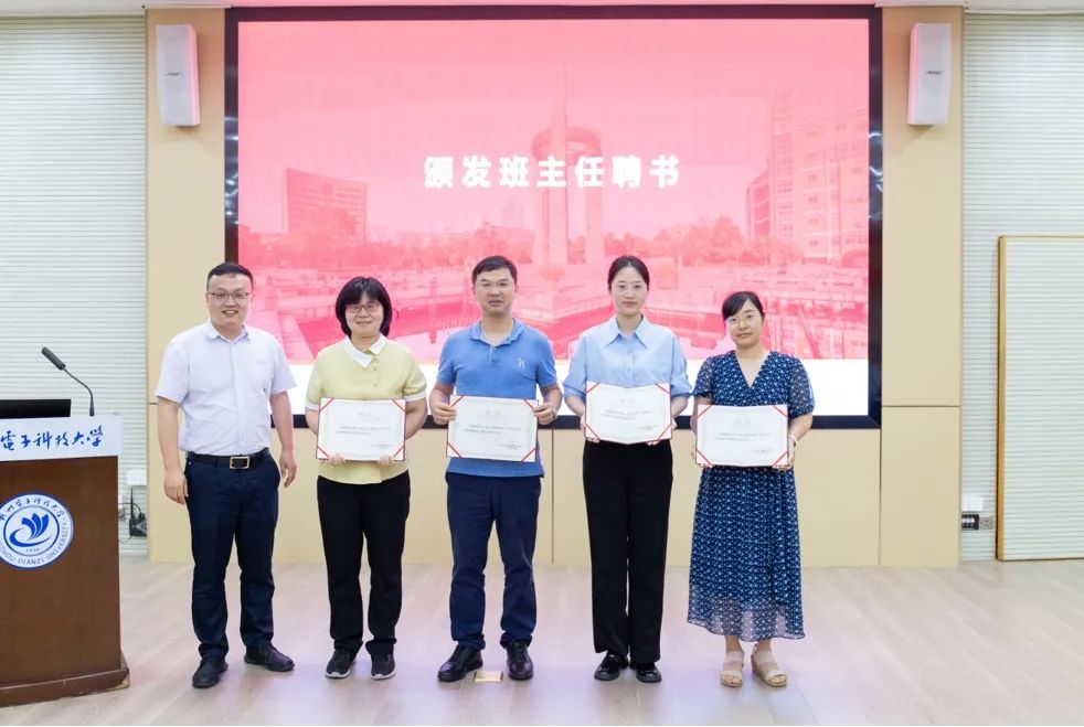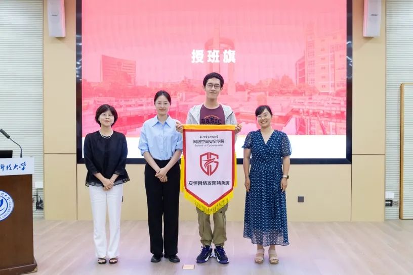 杭州電子科技大學(xué)教務(wù)處副處長鄭鵬(左一)、?杭州電子科技大學(xué)副校長周青(左二)、安恒信息高級(jí)副總裁馮旭杭(右二)、安恒信息浙江教育行業(yè)負(fù)責(zé)人彭實(shí)(右一)共同為安恒班揭牌