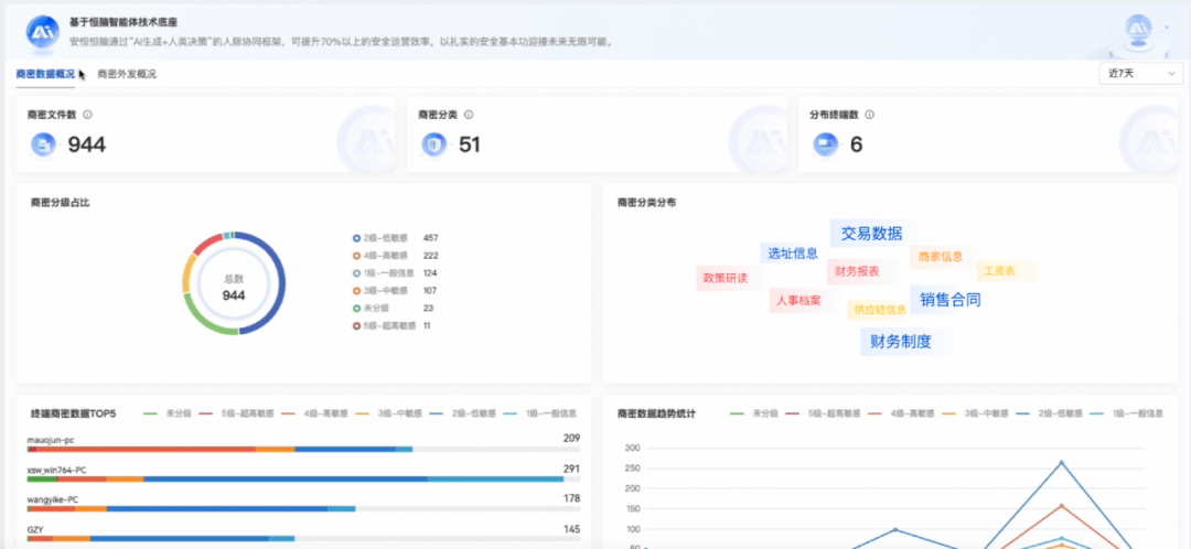 通過辦公智盾對全集團(tuán)下的辦公終端進(jìn)行智能數(shù)據(jù)盤點,迅速識別出分布在各終端上的財務(wù)報表、選址信息、交易記錄等敏感數(shù)據(jù),識別商業(yè)秘密信息,形成數(shù)據(jù)分布地圖,讓管理者對商業(yè)秘密的分布情況一目了然,為后續(xù)的數(shù)據(jù)防護(hù)工作提供有力的數(shù)據(jù)支撐。