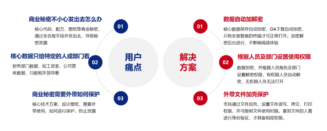 針對內(nèi)部人員這種商業(yè)秘密竊取行為,辦公智盾采用文件加密機(jī)制,通過下發(fā)加密策略,對重要文件進(jìn)行加密,即使文件不幸被竊取,由于加密保護(hù),第三方也無法查看文件內(nèi)容,有效防止了商業(yè)秘密的泄露。此外,對于需要外帶出去的商業(yè)秘密,辦公智盾提供文件加殼功能,限制文件的使用人、使用時間、使用次數(shù)以及打印權(quán)限,保障外出文檔的安全。