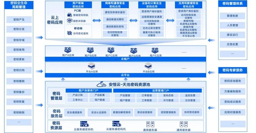 密碼服務(wù)層是密碼服務(wù)平臺(tái)將低層密碼資源經(jīng)過功能封裝,為云上信息系統(tǒng)提供的各類密碼服務(wù),包括但不限于密鑰管理服務(wù)、安全認(rèn)證服務(wù)、存儲(chǔ)加解密服務(wù)、安全通道服務(wù)等。各類服務(wù)支持按需訂購,符合云場(chǎng)景下用戶使用習(xí)慣。
