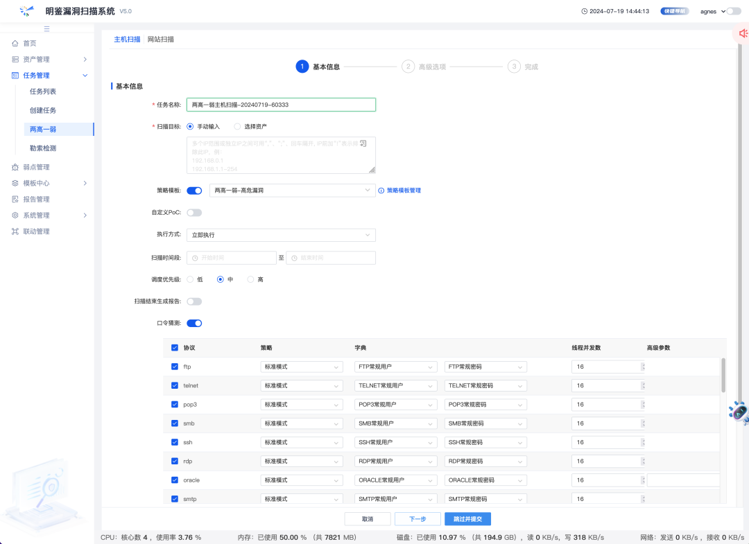 為快速響應(yīng)客戶需求,安恒資產(chǎn)脆弱性掃描與管理平臺(tái)(AVM)、明鑒漏洞掃描系統(tǒng)新版本增加“兩高一弱”專項(xiàng)掃描任務(wù)快速入口,依托豐富的行業(yè)客戶經(jīng)驗(yàn),對(duì)任務(wù)參數(shù)模板進(jìn)行針對(duì)性調(diào)優(yōu),滿足各類用戶需要,做到任務(wù)一鍵下發(fā)、威脅精準(zhǔn)檢測(cè)、報(bào)告靈活輸出。