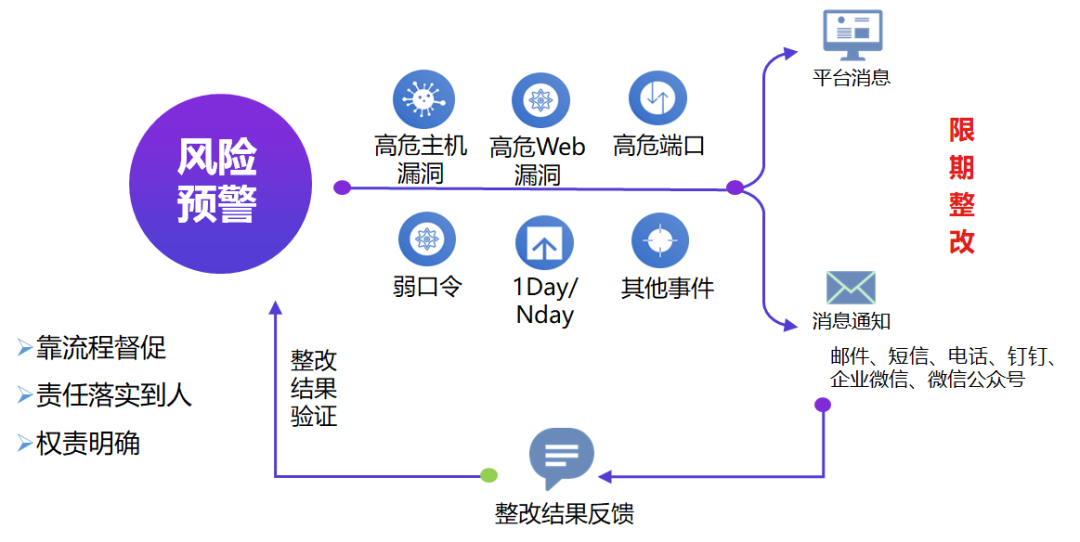 針對(duì)專項(xiàng)檢測(cè)發(fā)現(xiàn)的高危漏洞、高危端口、弱口令等風(fēng)險(xiǎn)問(wèn)題,通過(guò)靈活的工單流程通報(bào)督促相關(guān)單位責(zé)任人進(jìn)行整改。