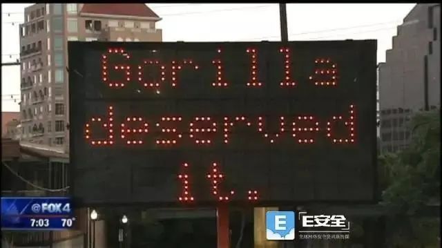 2016年6月5日,在美國達(dá)拉斯發(fā)生,電子留言板被篡改為“大猩猩自找(Gorilla deserved it)”,意指在辛辛那提動物園,三歲男孩爬過防護(hù)欄掉入大猩猩圍欄,管理員射殺稀有大猩猩事件;