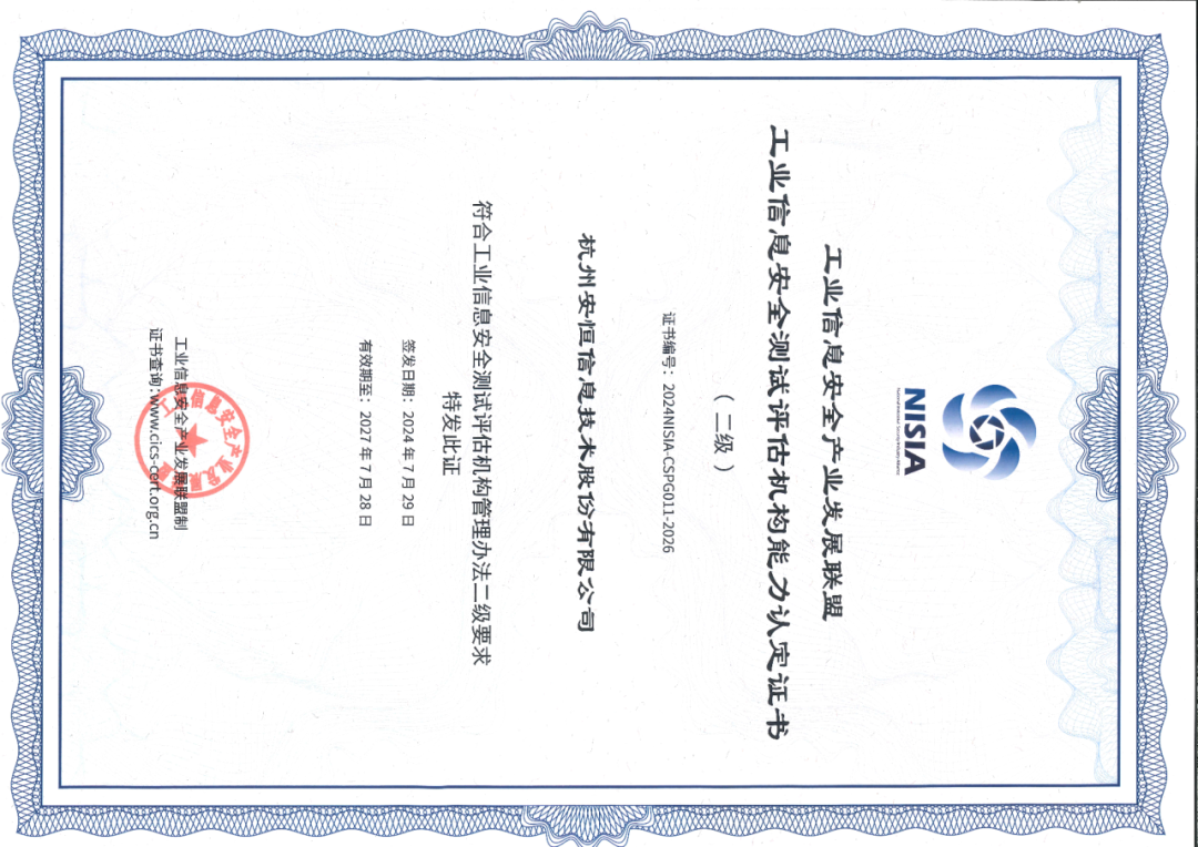 在近期由工業(yè)信息安全產(chǎn)業(yè)發(fā)展聯(lián)盟組織的工業(yè)信息安全測試評估機構(gòu)評審中,安恒信息憑借在工業(yè)信息安全領(lǐng)域的深厚積累與卓越表現(xiàn),成功晉升為工業(yè)信息安全測試評估機構(gòu)二級資質(zhì)單位,充分證明了安恒信息在工業(yè)信息安全測試評估方面的專業(yè)能力和成熟度。