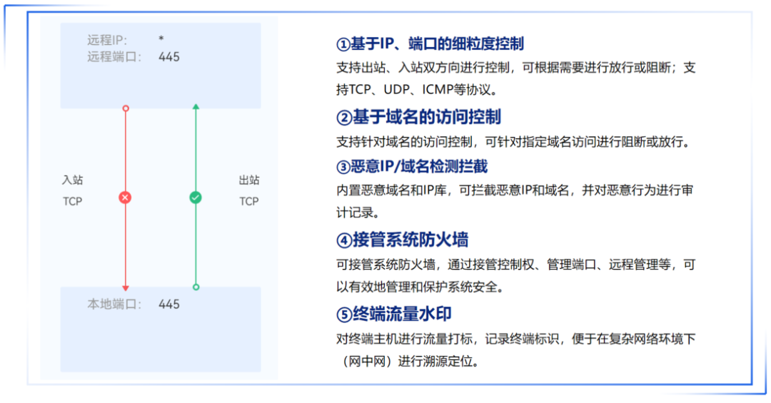 通過主機防火墻,基于IP和端口的出入站訪問策略,在終端之間建立細粒度的訪問控制。可一鍵封鎖終端,或禁止某些具體端口的訪問,在內(nèi)部網(wǎng)絡(luò)中創(chuàng)建更小的安全區(qū)域以限制橫向擴散,提升安全性。