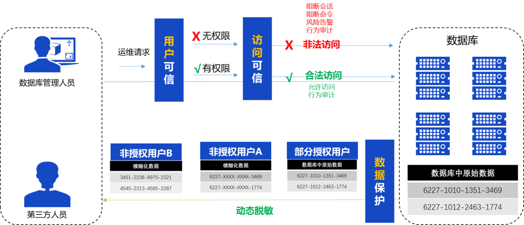 運(yùn)維人員日常訪問數(shù)據(jù)庫屬于隱性數(shù)據(jù)流通,因此需要對(duì)運(yùn)維人員進(jìn)行重點(diǎn)管控。可基于數(shù)據(jù)安全網(wǎng)關(guān)細(xì)化運(yùn)維人員訪問數(shù)據(jù)庫的權(quán)限,記錄運(yùn)維人員訪問數(shù)據(jù)的行為,基于梳理的敏感數(shù)據(jù)目錄按照運(yùn)維權(quán)限進(jìn)行數(shù)據(jù)動(dòng)態(tài)脫敏,防止多次、少量數(shù)據(jù)查詢導(dǎo)致的點(diǎn)滴式數(shù)據(jù)泄露風(fēng)險(xiǎn)。