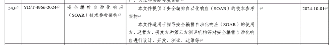 近日,工業(yè)和信息化部公告(2024年第18號)批準發(fā)布了多項行業(yè)標準,由中國通信標準化協(xié)會提出并歸口,安恒信息牽頭制定的YD/T 4966-2024《安全編排自動化響應(SOAR)技術參考架構》發(fā)布,并將于10月1日正式實施。