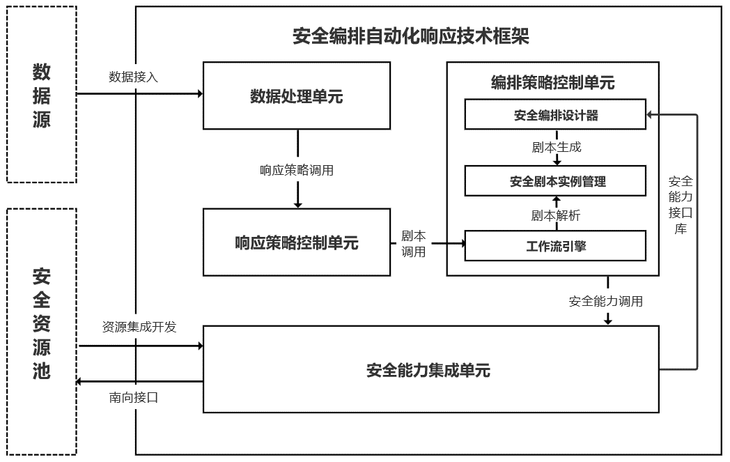 安全編排自動化響應參考架構至少包括數(shù)據(jù)處理單元、響應策略控制單元、編排策略控制單元、安全能力集成單元。