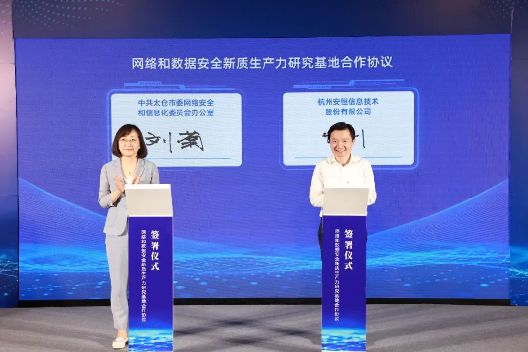 現(xiàn)場(chǎng),太倉市委宣傳部常務(wù)副部長(zhǎng)、市委網(wǎng)信辦主任劉菊、安恒信息董事長(zhǎng)范淵共同簽署了太倉市網(wǎng)絡(luò)和數(shù)據(jù)安全新質(zhì)生產(chǎn)力研究基地合作協(xié)議。安恒信息將助力太倉創(chuàng)新建設(shè)網(wǎng)絡(luò)和數(shù)據(jù)安全新質(zhì)生產(chǎn)力研究基地,助推太倉相關(guān)產(chǎn)業(yè)網(wǎng)絡(luò)化、數(shù)字化、智能化加速轉(zhuǎn)型,大力發(fā)展以數(shù)據(jù)為關(guān)鍵要素的新質(zhì)生產(chǎn)力。