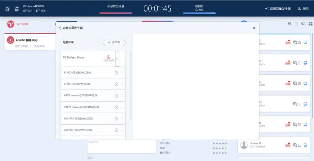 根據(jù)應(yīng)急演練場景下的訓練需求,為各類場景環(huán)境預(yù)設(shè)了特定的攻擊流量,可在訓練開始時進行啟用。啟用后,攻擊機會將攻擊流和惡意軟件導(dǎo)入到網(wǎng)絡(luò)中,并自動根據(jù)不同的網(wǎng)絡(luò)區(qū)域進行操作。外部可模擬外來威脅攻擊,內(nèi)部可模擬用戶誤操作或用戶惡意行為,能夠滿足高仿真實訓場景的構(gòu)建需求。