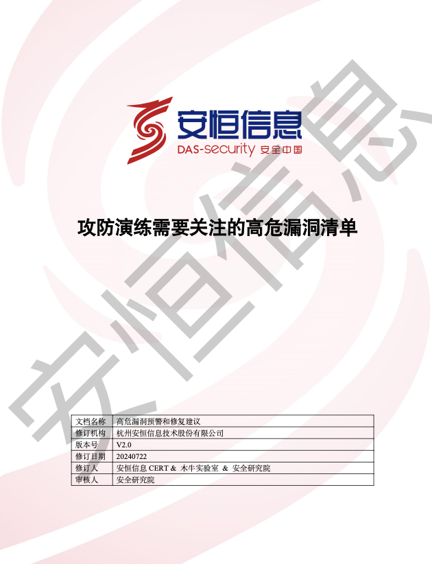2024攻防演練期間需關(guān)注的高危漏洞清單安恒信息CERTNOTICE點(diǎn)?1.前言當(dāng)前,在規(guī)模較大和重要性較高的網(wǎng)絡(luò)攻防演練中,藍(lán)隊(duì)(防守方)遇到紅隊(duì)(攻擊方)0day的機(jī)會(huì)還是相當(dāng)大的。要在短時(shí)間達(dá)成演習(xí)目的,最高效的方式便是拿到目標(biāo)靶機(jī)的權(quán)限,動(dòng)用一些先進(jìn)的武器(0day)進(jìn)行快速突破。從過(guò)往經(jīng)驗(yàn)來(lái)看,所出現(xiàn)的0day漏洞主要包括Web服務(wù)、組件的反序列化漏洞,具體暴露系統(tǒng)多為OA系統(tǒng)、郵件系統(tǒng)、CMS等邊界系統(tǒng)。在演練中這類(lèi)系統(tǒng)