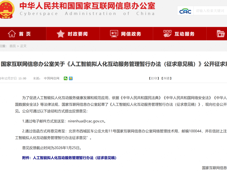 劃重點|事關(guān)AI擬人化互動!國家網(wǎng)信辦發(fā)布最新辦法公開征求意見