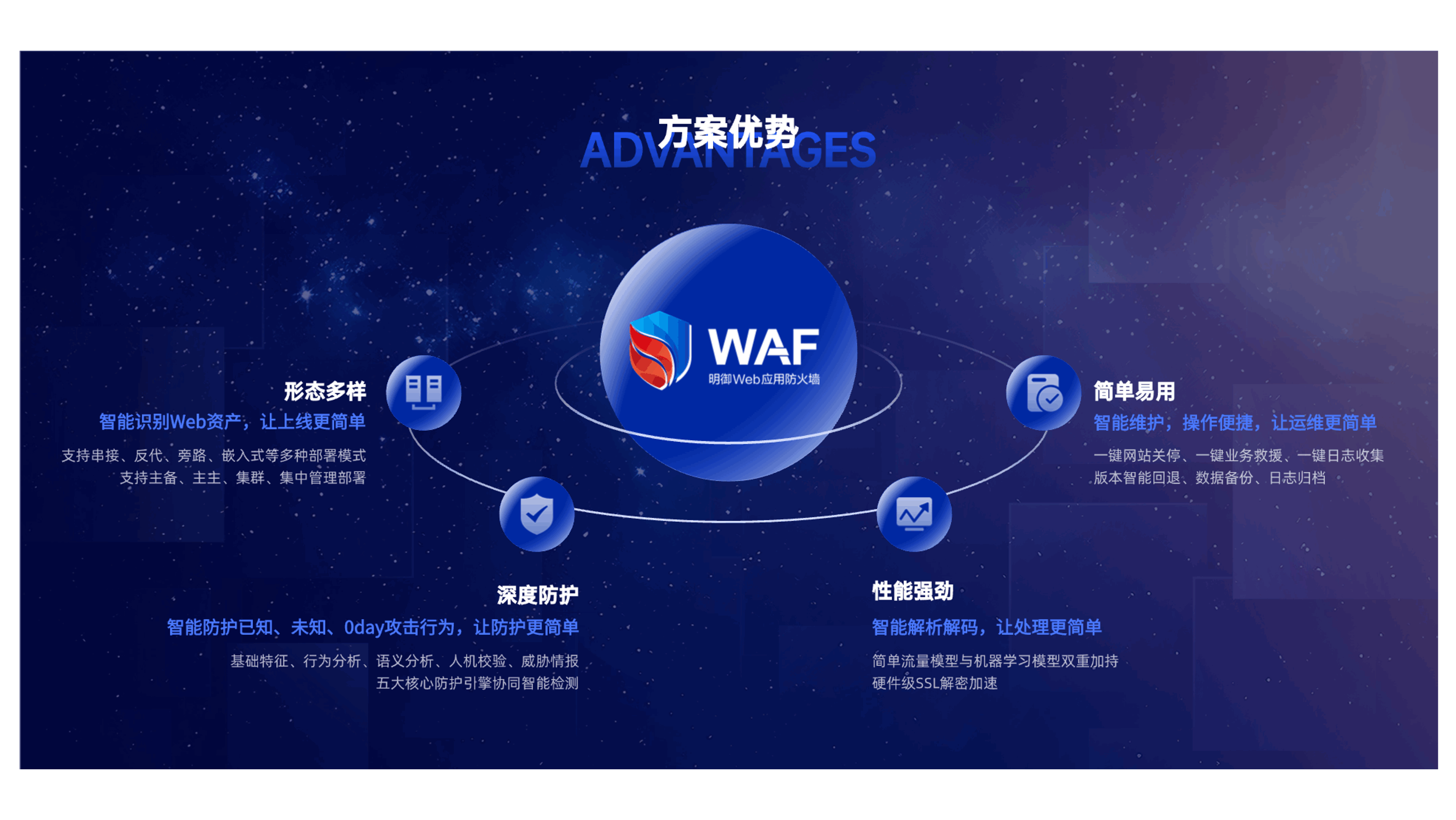 支持主流軟硬件部署方案。支持嵌入式部署,聯(lián)動(dòng)Nginx實(shí)現(xiàn)完全旁路的高穩(wěn)定性、高防護(hù)性、高擴(kuò)展性的部署方式選擇