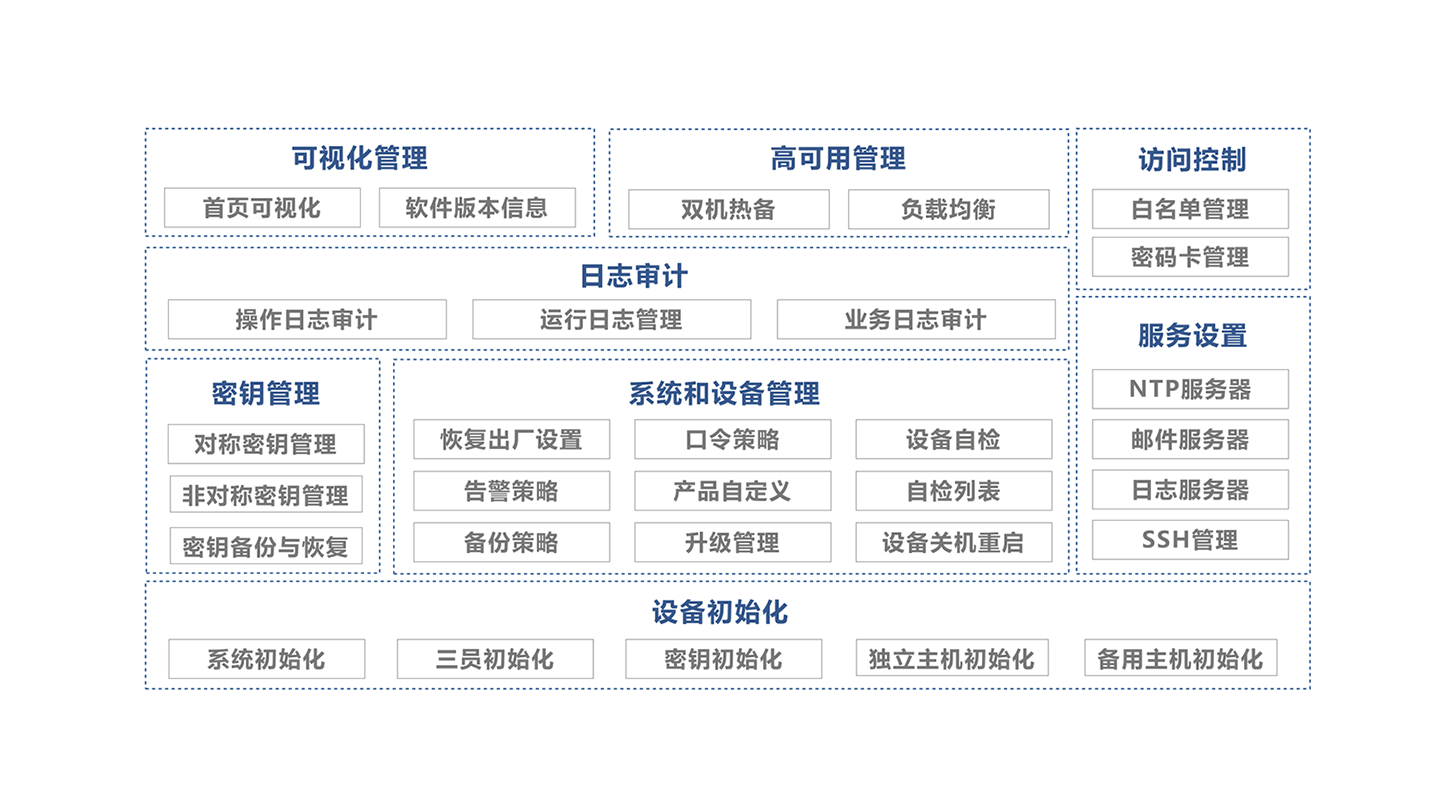 產(chǎn)品初始化向?qū)б龑?dǎo)用戶快速完成設(shè)備初始化的流程,完成設(shè)備工作狀態(tài)的轉(zhuǎn)換,快速上手服務(wù)器密碼機