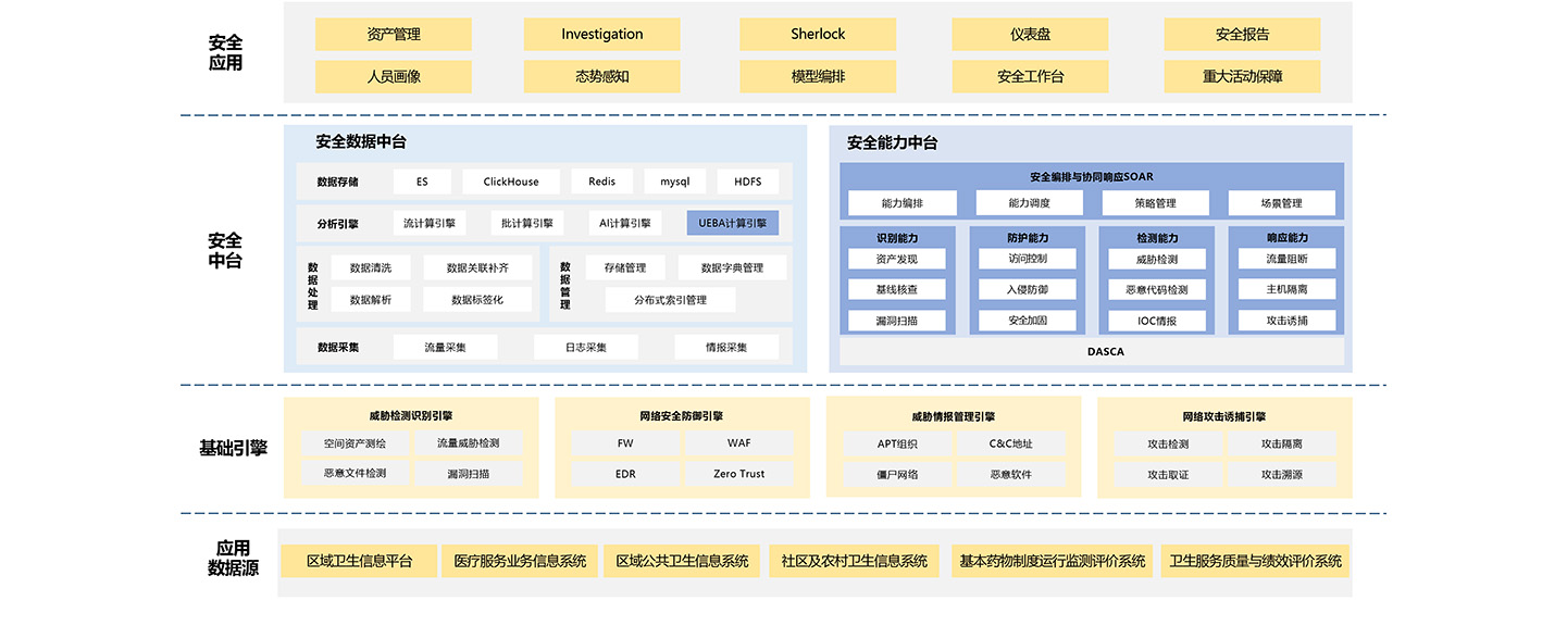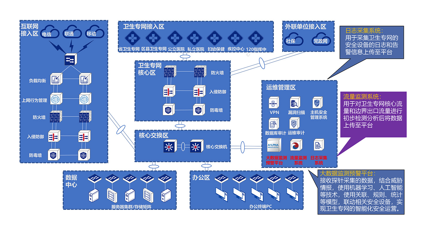 通過(guò)建設(shè)體系化的衛(wèi)生專網(wǎng)大數(shù)據(jù)監(jiān)測(cè)預(yù)警平臺(tái),以合法合規(guī)為基本原則,構(gòu)建衛(wèi)生專網(wǎng)基礎(chǔ)安全能力底座,支撐安全態(tài)勢(shì)監(jiān)測(cè)分析,實(shí)現(xiàn)智能安全運(yùn)營(yíng),為整個(gè)衛(wèi)生專網(wǎng)安全保駕護(hù)航。