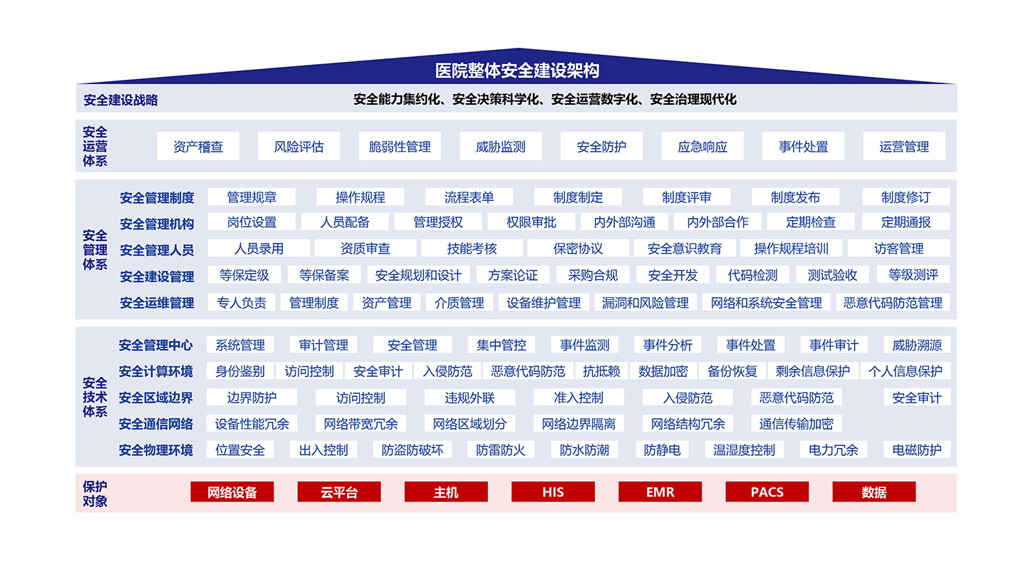 方案設(shè)計(jì)綜合參考《電子病歷系統(tǒng)應(yīng)用水平分級(jí)評(píng)價(jià)標(biāo)準(zhǔn)(試行)》《醫(yī)院信息互聯(lián)互通標(biāo)準(zhǔn)化成熟度測(cè)評(píng)方案(2020年版)》《醫(yī)院智慧服務(wù)分級(jí)評(píng)估標(biāo)準(zhǔn)體系(試行)》《醫(yī)院智慧管理分級(jí)評(píng)估標(biāo)準(zhǔn)體系(試行)》等醫(yī)院信息化建設(shè)標(biāo)準(zhǔn),形成檢測(cè)、防護(hù)、響應(yīng)和恢復(fù)的保障體系,從而建立有針對(duì)性的合規(guī)性安全保障體系框架和安全防護(hù)措施。滿足醫(yī)療衛(wèi)生行業(yè)評(píng)級(jí)要求。