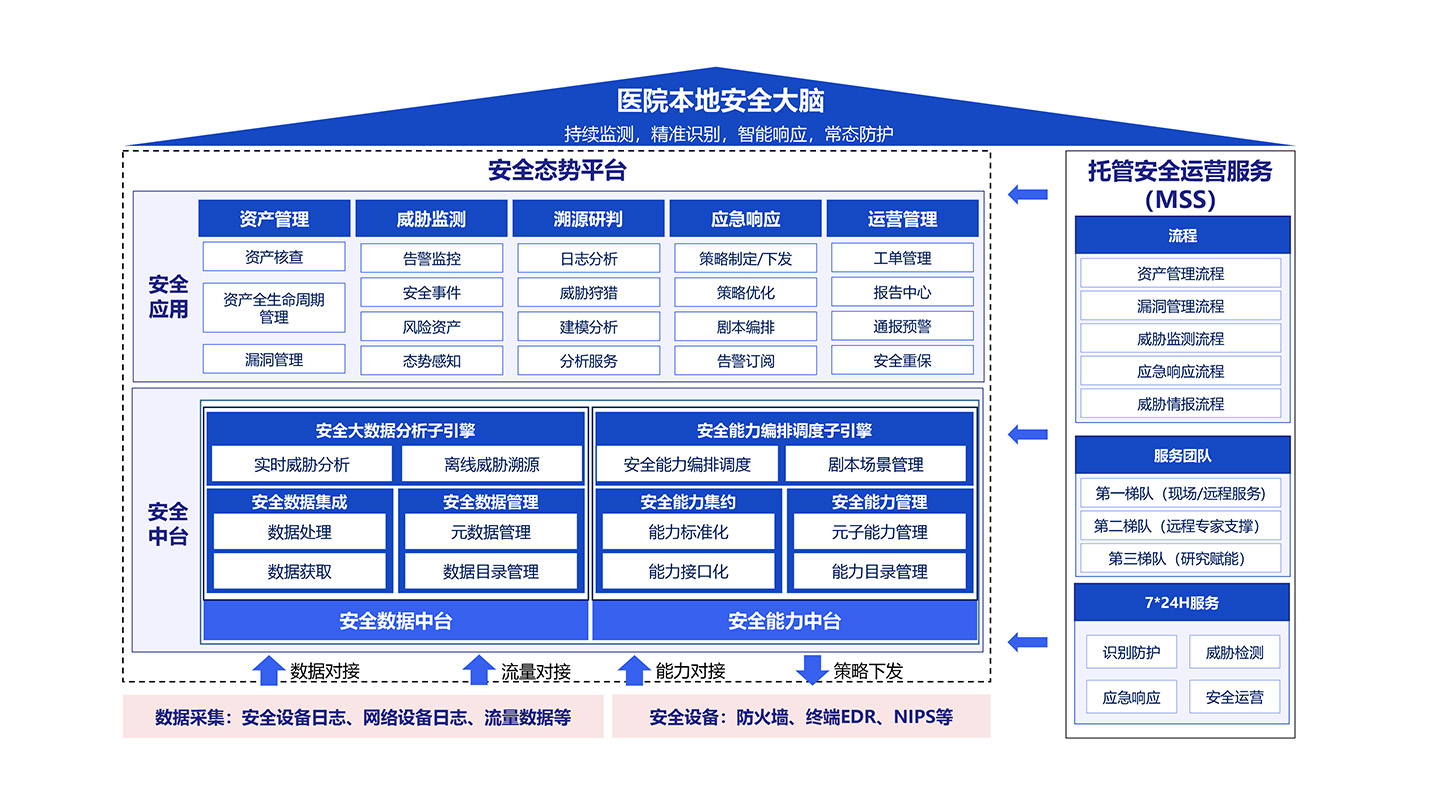醫(yī)院安全態(tài)勢感知體系解決方案由兩部分組成,第一部分為部署在醫(yī)院本地端的安全態(tài)勢感知平臺,另一部分為云端的安全托管運營服務MSS。通過線上服務與線下平臺相結(jié)合,提供安全持續(xù)運營能力,安全威脅先發(fā)現(xiàn)、先研判、先處置。