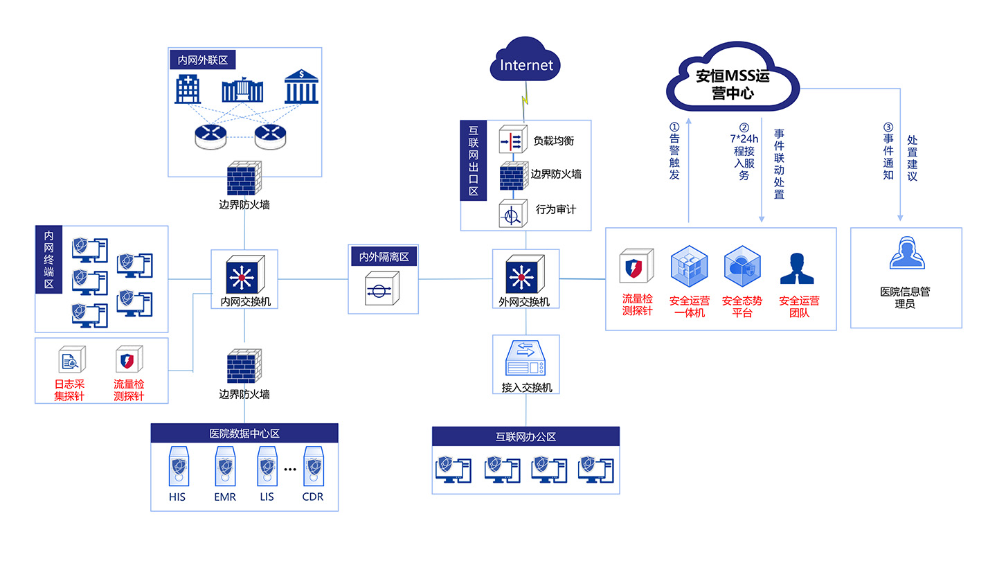 1.在核心機房部署態(tài)勢感知平臺:用于分析流量采集探針和日志采集探針的分析結(jié)果,同時與云端安全托管運營服務MSS配合,作為MSS安全信息來源,面向醫(yī)院提供整體安全閉環(huán)管理;
