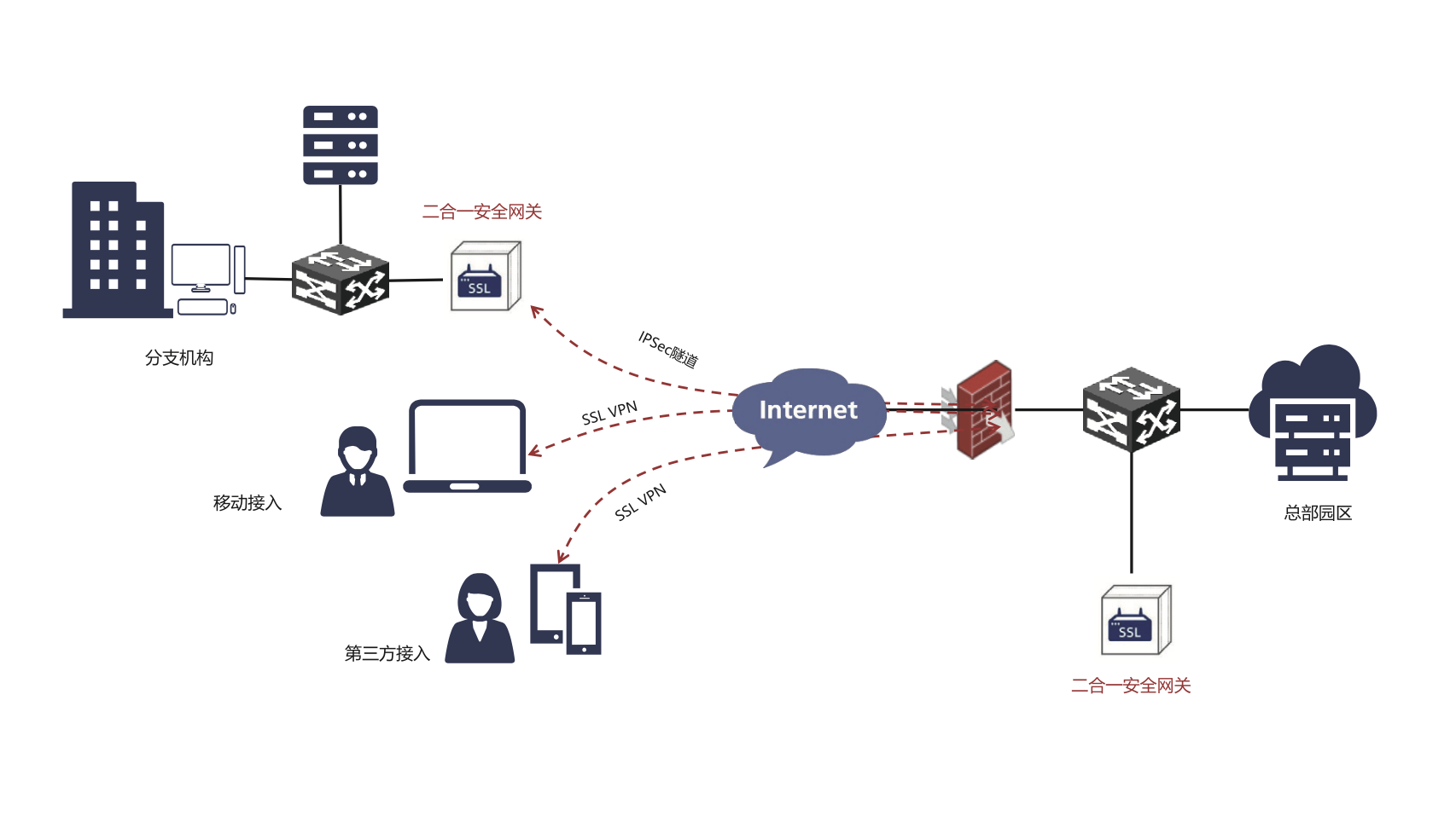 IPSec/SSL VPN綜合安全網(wǎng)關(guān)是一款能夠有效防止業(yè)務(wù)數(shù)據(jù)在網(wǎng)絡(luò)傳輸中被竊取、篡改的網(wǎng)絡(luò)安全產(chǎn)品,為用戶提供了完善的內(nèi)部網(wǎng)絡(luò)或應(yīng)用程序的安全遠(yuǎn)程接入服務(wù)以及各分支機(jī)構(gòu)局域網(wǎng)之間的數(shù)據(jù)安全傳輸和安全訪問(wèn)服務(wù)。