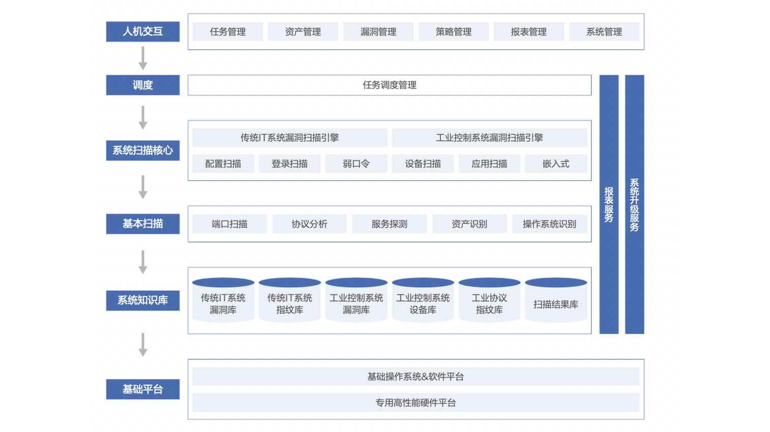 同時(shí)具備對(duì)OT與IT資產(chǎn)的漏洞掃描能力,包括支持傳統(tǒng)IT資產(chǎn)的操作系統(tǒng)、服務(wù)、網(wǎng)絡(luò)設(shè)備、WEB應(yīng) 用、數(shù)據(jù)庫(kù)、中間件等、Vxworks、eCos、QNX等嵌入式操作系統(tǒng)的漏掃掃描與配置核查。