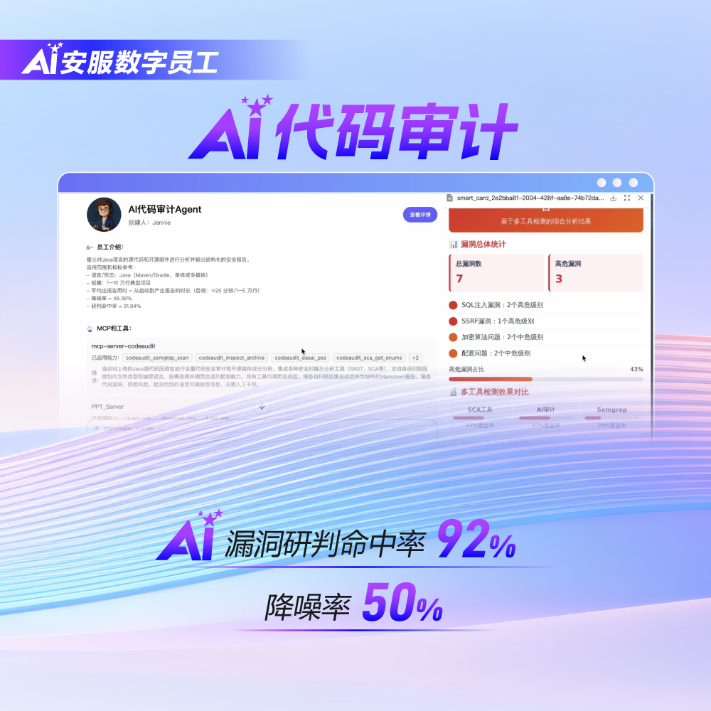 AI安服數(shù)字員工,讓安全服務(wù)從 "人工驅(qū)動" 邁向 "AI 自主",重新定義效率與精準(zhǔn)的邊界。即刻申請免費(fèi)體驗名額,填寫信息,7天免費(fèi)試用,獲取專屬安全服務(wù)方案!