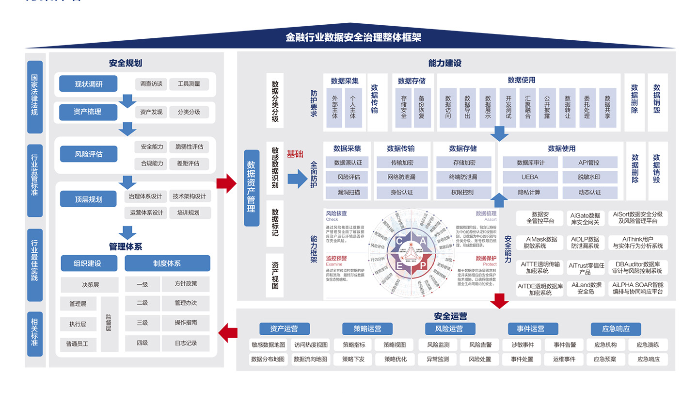 數(shù)據(jù)安全能力建設(shè),以數(shù)據(jù)安全分級(jí)為基礎(chǔ),建立覆蓋數(shù)據(jù)生命周期全過程的安全防護(hù)體系,防護(hù)要求以《金融數(shù)據(jù)安全數(shù)據(jù)生命周期安全規(guī)范》中的防護(hù)要求為依據(jù),以數(shù)據(jù)安全相關(guān)技術(shù)能力及產(chǎn)品為能力底座,全面加強(qiáng)金融行業(yè)數(shù)據(jù)安全保護(hù)能力。