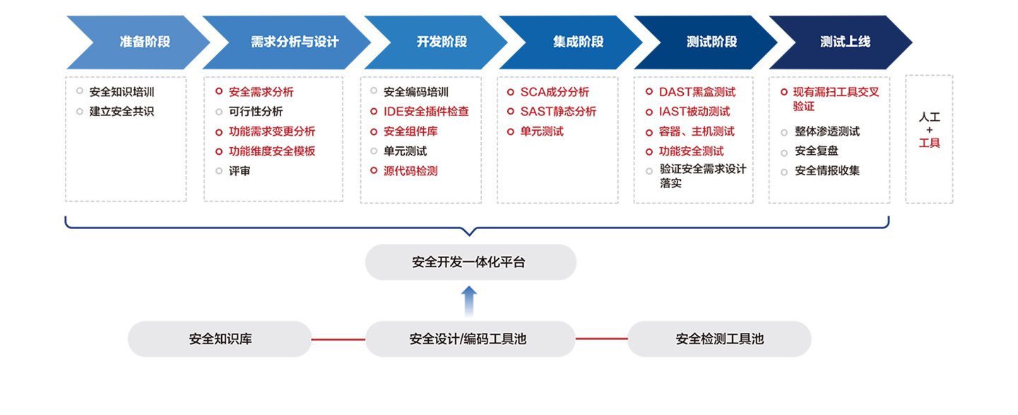 搭建安全開發(fā)一體化平臺,采用人工+工具的方式,與企業(yè)現(xiàn)有流程完美融合,達成流程自動化,做到安全工作有據可依。